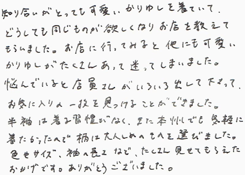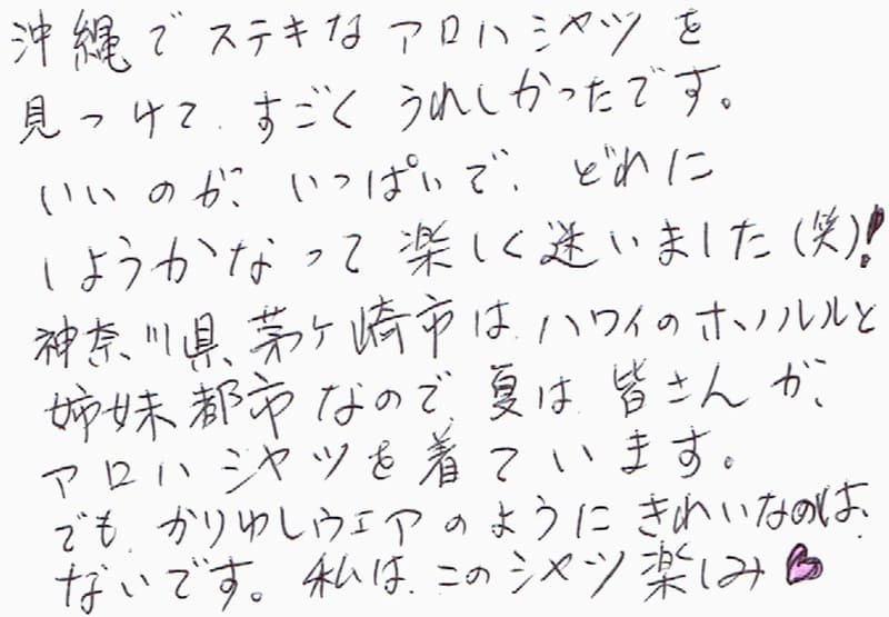 知り合いがとっても可愛いかりゆしを着ていて、どうしても同じものが欲しくなりお店を教えてもらいました。お店に行ってみると他にも可愛いかりゆしがたくさんあって迷ってしまいました。悩んでいると店員さんがいろいろ出して下さって、お気に入りの一枚を見つけることができました。半袖は着る習慣がなく、また本州でも気軽に着たかったので柄は大人しめのものを選びました。色やサイズ、袖の長さなど、たくさん見せてもらえたおかげです。ありがとうございました。