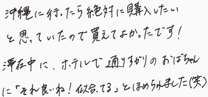 沖縄に行ったら絶対に購入したいと思っていたので買えてよかったです!滞在中に、ホテルで通りすがりのおばちゃんに「それ良いね!似合ってる」とほめられました(笑)