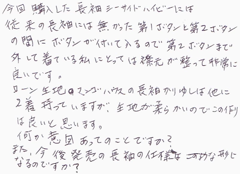 今回購入した長袖シーサイドハイビーには従来の長袖には無かった第1ボタンと第2ボタンの間にボタンが付いて入るので第2ボタンまで外して着ている私にとっては襟元が整って非常に良いです。ローン生地マンゴハウスの長袖かりゆしは他に2着持っていますが、生地が柔らかいのでこの作りは良いと思います。何か意図あってのことですか?また、今後発売の長袖の仕様はこのような形になるのですか?