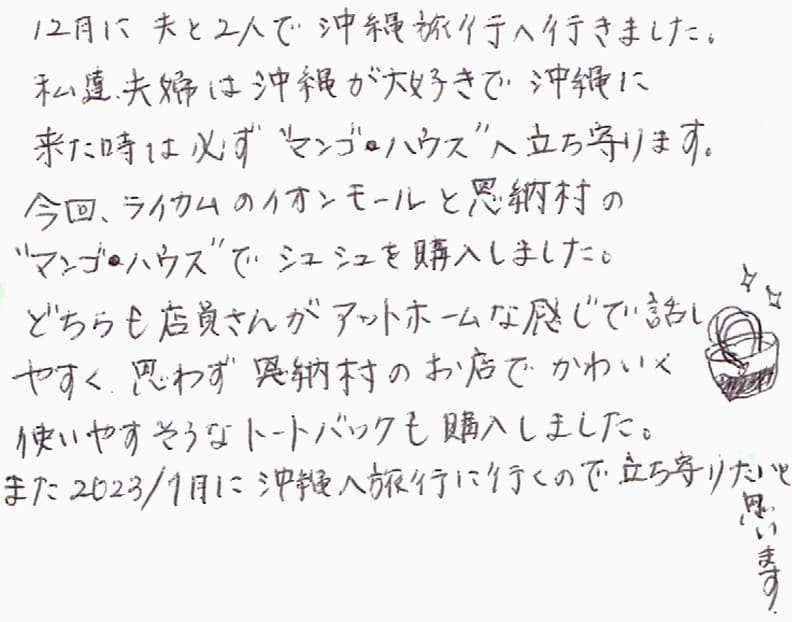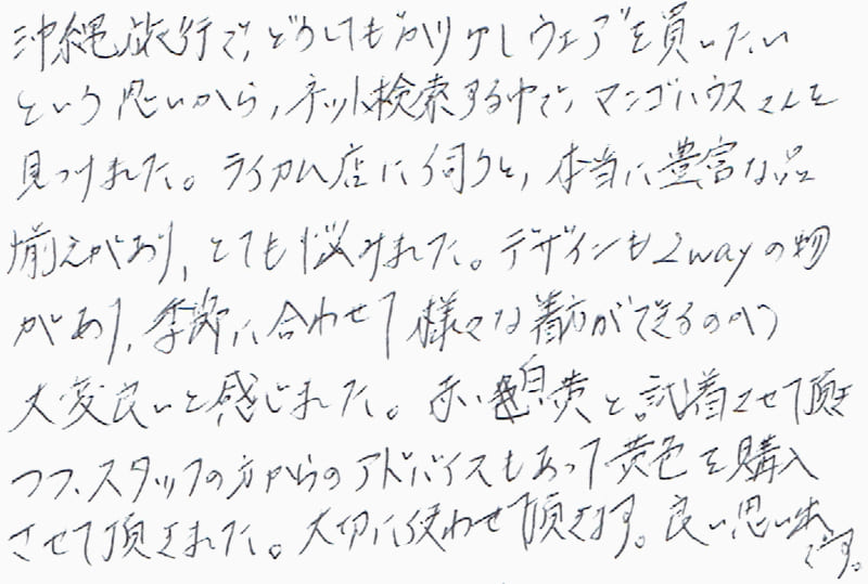 沖縄旅行で、どうしても“かりゆしウェア”を買いたいという思いから、ネット検索する中で、マンゴハウスさんを見つけました。ライカム店に伺うと、本当に豊富な品揃えがあり、とても悩みました。デザインも2wayの物があり、季節に合わせて様々な着方ができるのが大変良いと感じました。赤・白・黄と試着させて頂きつつ、スタッフの方からのアドバイスもあって黄色を購入させて頂きました。大切に使わせて頂きます。良い思い出です。