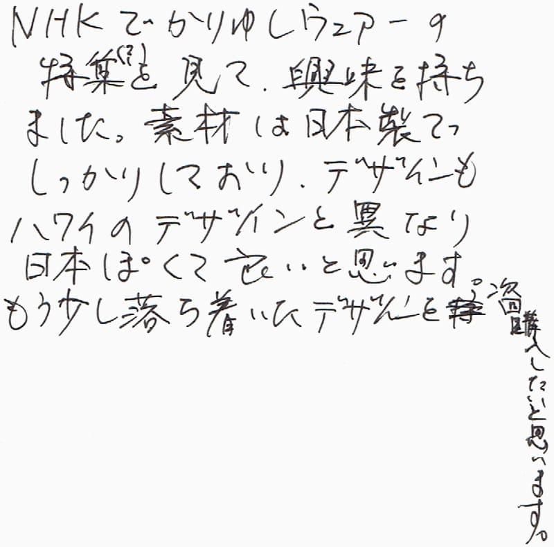 NHKでかりゆしウェアーの特集を見て、興味を持ちました。素材は日本製でしっかりしており、デザインもハワイのデザインと異なり日本ぽくて良いと思います。もう少し落ち着いたデザインを次回購入したいと思います。