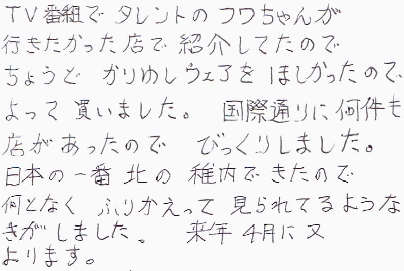 TV番組でタレントのフワちゃんが行きたかった店で紹介してたのでちょうどかりゆしウェアをほしかったのでよって買いました。国際通りに何件も店があったのでびっくりしました。日本で一番北の稚内できたので何となくふりかえって見られてるようなきがしました。来年4月に又よります。