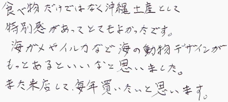 食べ物だけではなく沖縄土産として特別感があってとてもよかったです。海ガメやイルカなど海の動物デザインがもっとあるといいなと思いました。また来店して、毎年買いたいと思います。
