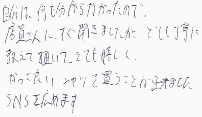 自分は、何も分からなかったので、店員さんに、すぐ聞きましたが、とても丁寧に教えて頂いて、とても嬉しく、かっこ良いシャツを買うことが出来ました。SNSを広めます。
