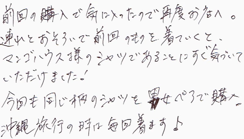 前回の購入で気に入ったので再度お店へ。連れとおそろいで前回のものを着ていくと、マンゴハウス様のシャツであることにすぐ気づいていただけました!今回も同じ柄のシャツを男女ペアで購入。沖縄旅行の時は毎回着ます♪