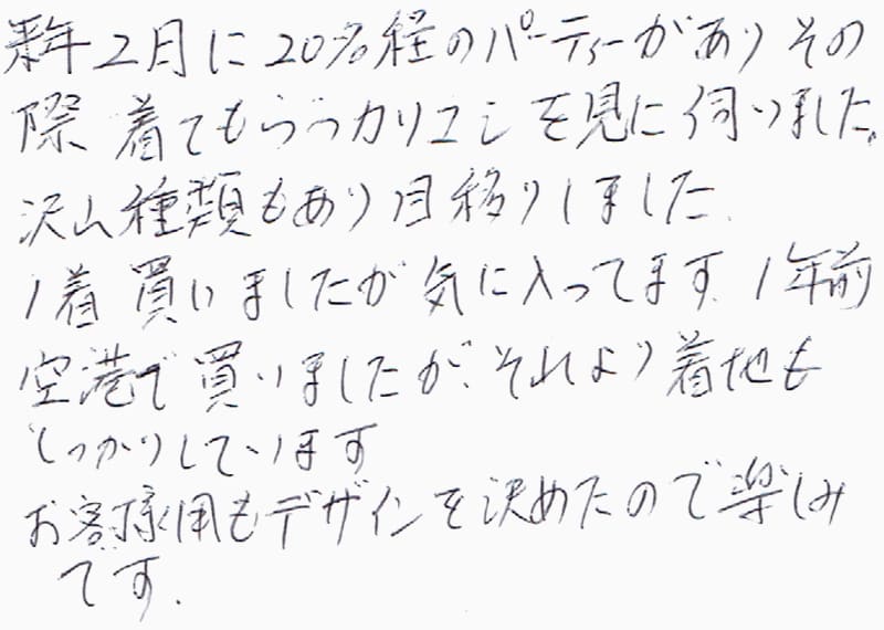 来年2月に20名程のパーティーがありその際着てもらうカリユシを見に伺いました。沢山種類もあり目移りしました。1着買いましたが気に入ってます。1年前空港で買いましたが、それより着地もしっかりしています。お客様用のデザインも決めたので楽しみです。