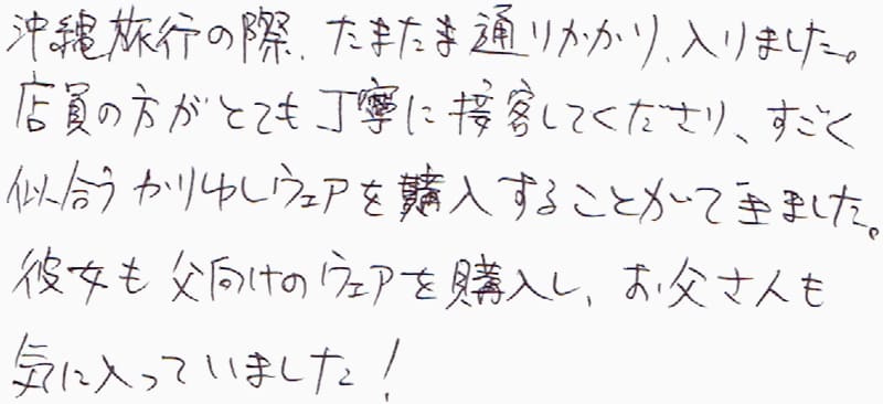 - それぞれに合ったかりゆしウェアを見つけることができました。