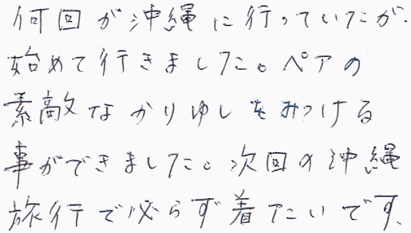 何回か沖縄に行っていたが、始めて行きました。ペアの素敵なかりゆしをみつける事ができました。次回の沖縄旅行で必らず着たいです。