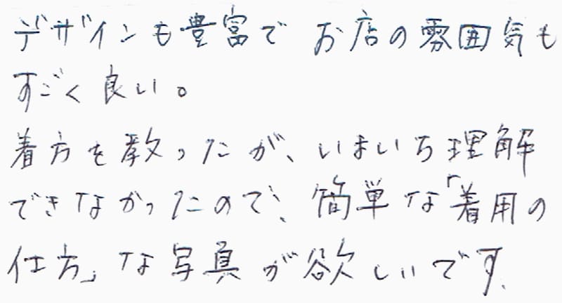 デザインも豊富でお店の雰囲気もすごく良い。着方も教ったが、いまいち理解できなかったので、簡単な「着用の仕方」な写真が欲しいです。