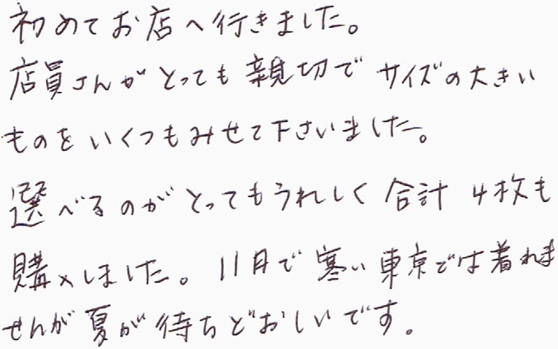 初めてお店へ行きました。店員さんがとっても親切でサイズの大きいものをいくつもみせて下さいました。選べるのがとってもうれしく合計4枚も購入しました。11月で寒い東京では着れませんが夏が待ちどおしいです。