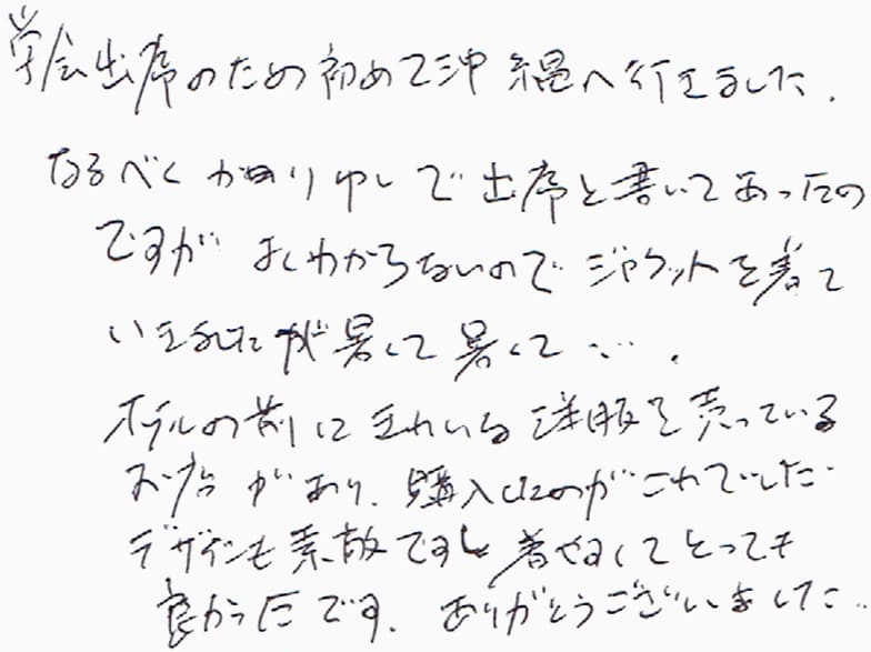 学会出席のため初めて沖縄へ行きました。なるべくかりゆしで出席と書いてあったのですが、よくわからないのでジャケットを着ていきましたが暑くて暑くて…。ホテルの前にきれいな洋服を売っているお店があり、購入したのがこれでした。デザインも素敵ですし着やすくてとっても良かったです。ありがとうございました。