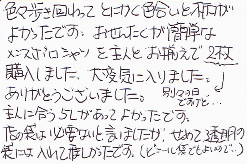 色々歩き回ってとにかく色合いと柄がよかったです。おせんたくが簡単なメンズポロシャツを主人とお揃えで2枚購入しました。大変気に入りました。ありがとうございました。主人に合う5Lがあってよかったです。店の袋は必要ないと言いましたが、せめて透明の袋には入れてほしかったです。(ビニール袋でもよいので。)→雨が降っていたので…