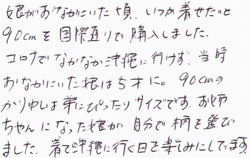 娘がおなかにいた頃、いつか着せたいと90㎝を国際通りで購入しました。コロナでなかなか沖縄に行けず、当時おなかにいた娘は5才に。90㎝のかりゆしは弟にぴったりサイズです。お姉ちゃんになった娘が自分で柄を選びました。着て沖縄に行く日を楽しみにしています。