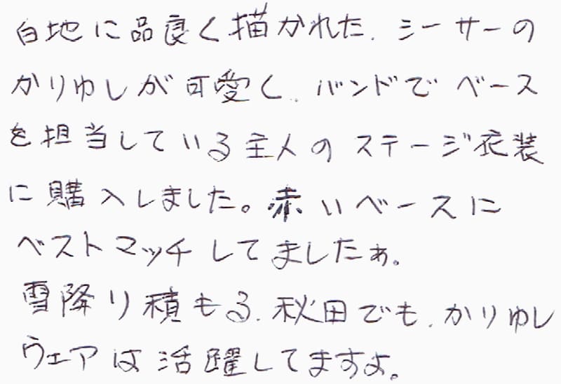 白地に品良く描かれた、シーサーのかりゆしが可愛く、バンドでベースを担当している主人のステージ衣装に購入しました。赤いベースにベストマッチしてましたぁ。雪降り積もる、秋田でも、かりゆしウェアは活躍してますよ。