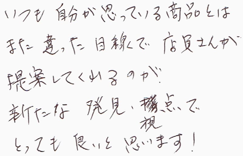 いつも自分が思っている商品とはまた違った目線で店員さんが提案してくれるのが、新たな発見、視点でとっても良いと思います!