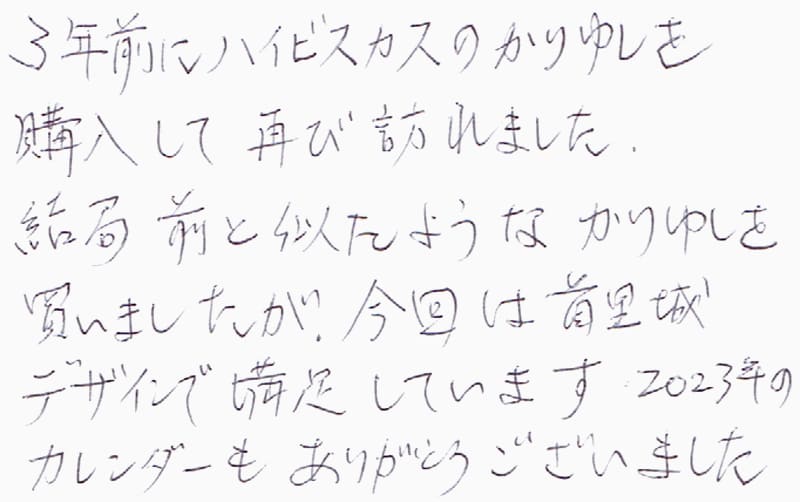 3年前にハイビスカスのかりゆしを購入して再び訪れました。結局前と似たようなかりゆしを買いましたが、今回は首里城デザインで満足しています。2023年のカレンダーもありがとうございました。