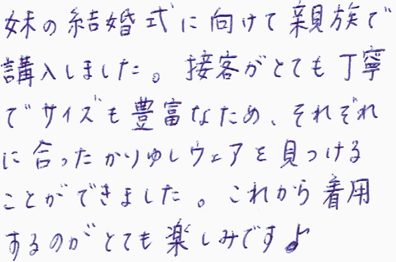 妹の結婚式に向けて親族で購入しました。接客がとても丁寧でサイズも豊富なため、それぞれに合ったかりゆしウェアを見つけることができました。これから着用するのがとても楽しみです♪
