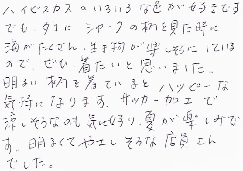 ハイビスカスのいろいろな色が好きです。でも、タコにシャークの柄を見た時に海がたくさん、生き物が楽しそうにしているので、ぜひ着たいと思いました。明るい柄を着ているとハッピーな気持になります。サッカー加工で涼しそうなのも気に好り、夏が楽しみです。明るくてやさしそうな店員さんでした。