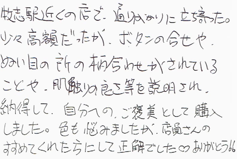 牧志駅近くの店で、通りがかりに立ち寄った。少々高額だったが、ボタンの合せや、ぬい目の所の柄合わせがされていることや、肌触りの良さ等を説明され、納得して、自分への、ご褒美として購入しました。色も悩みましたが、店員さんのすすめてくれた方にして正解でした。ありがとう!!