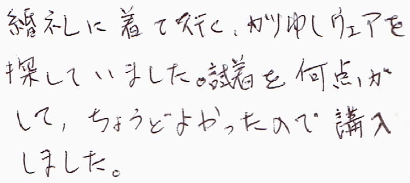 婚礼に着て行く、かりゆしウェアを探していました。試着を何点かして、ちょうどよかったので購入しました。