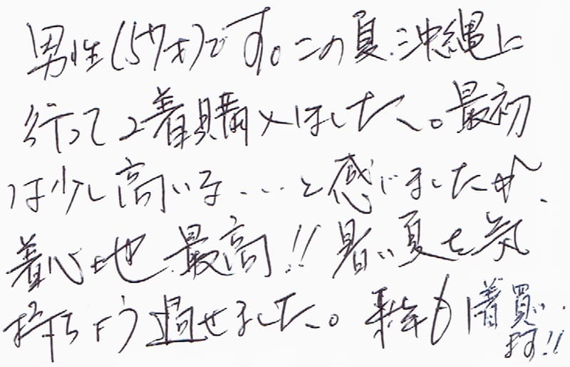 男性(57才)です。この夏、沖縄に行って2着購入しました。最初は少し高いな…と感じましたが、着心地最高!!暑い夏を気持ちよう過ごせました。来年も1着買います!!