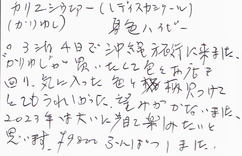 3泊4日で沖縄旅行に来ました。“かりゆし”が買いたくて色々お店を回り、気に入った色と柄見つけてとてもうれしかった。望みがかないました。2023年は大いに着て楽しみたいと思います。\9800ふんぱつしました。