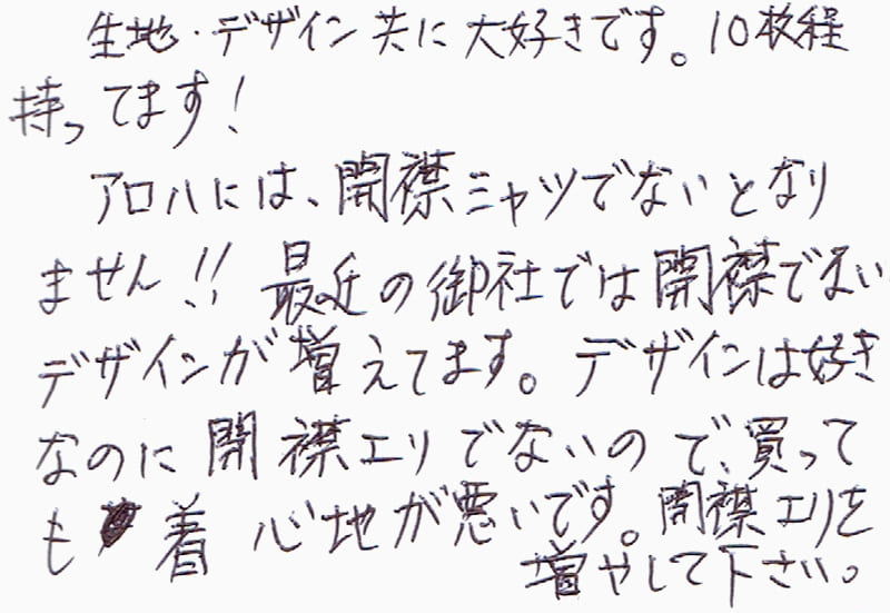 生地・デザイン共に大好きです。10枚程持ってます!アロハには、開襟シャツでないとなりません!!最近の御社では開襟でないデザインが増えてます。デザインは好きなのに開襟エリでないので、買っても着心地が悪いです。開襟エリを増やして下さい。