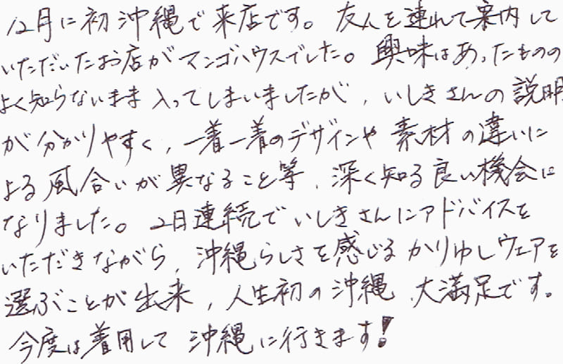 12月に初沖縄で来店です。友人を連れて案内していただいたお店がマンゴハウスでした。興味はあったもののよく知らないままお店に入ってしまいましたが、いしきさんの説明がわかりやすく、一着一着のデザインや素材の違いによる風合いが異なること等、深く知る良い機会になりました。2日連続でいしきさんにアドバイスをいただきながら、沖縄らしさを感じるかりゆしウェアを選ぶことが出来、人生初の沖縄、大満足です。今度は着用して沖縄に行きます!