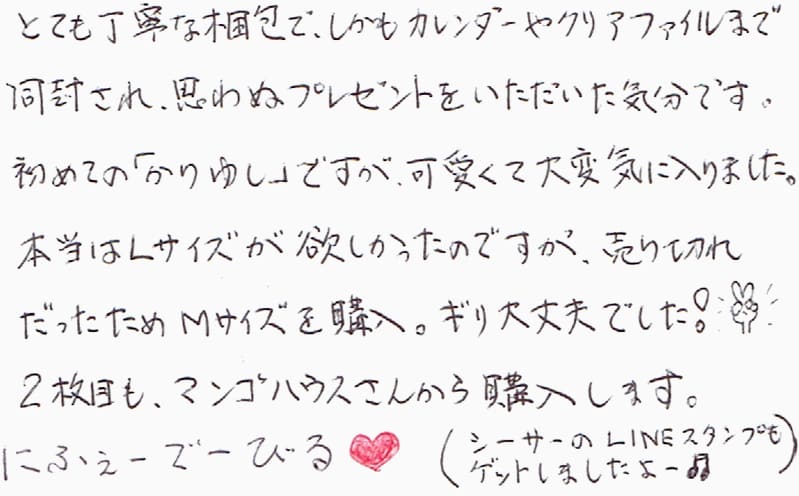 とても丁寧な梱包で、しかもカレンダーやクリアファイルまで同封され、思わぬプレゼントを頂いた気分です。初めての「かりゆし」ですが、可愛くて大変気に入りました。本当はLサイズが欲しかったので酢が、売り切れだったためMサイズを購入。ギリ大丈夫でした!2枚目も、マンゴハウスさんから購入します。にふぇーでーびる?(シーサーのLINEスタンプもゲットしましたよー♪)