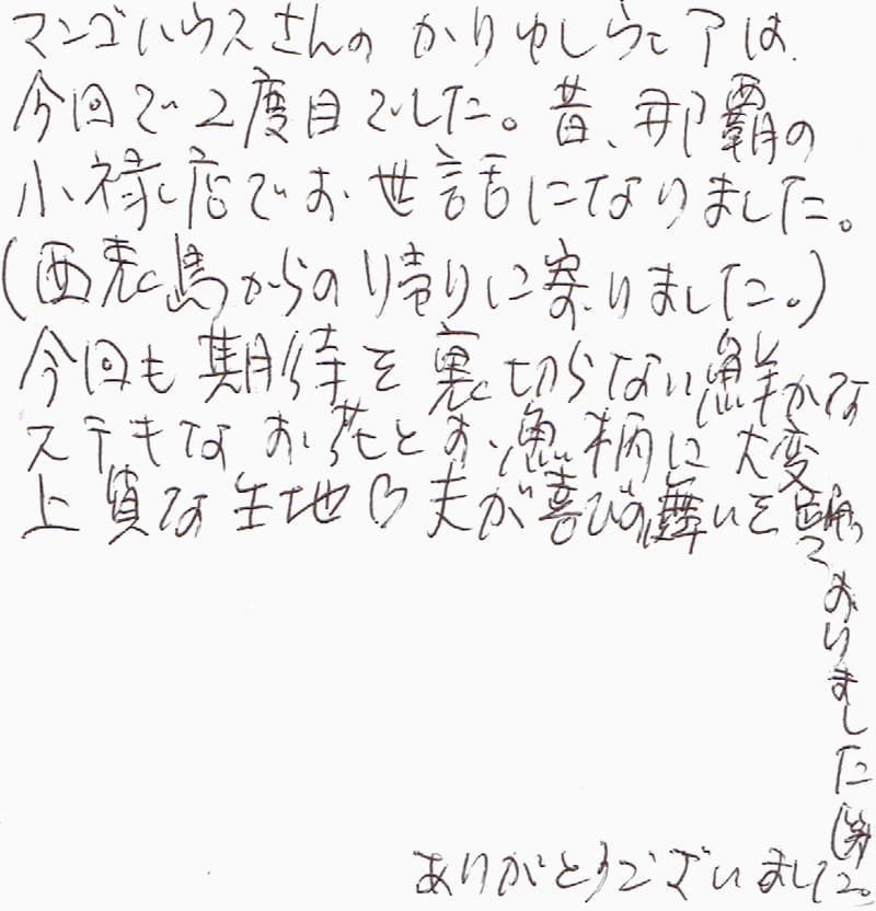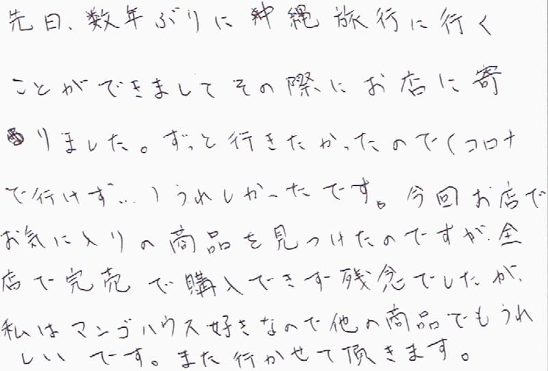 先日、数年ぶりに沖縄旅行に行くことができましてその際にお店に寄りました。ずっと行きたかったので(コロナで行けず…)うれしかったです。今回お店でお気に入りの商品を見つけたのですが全店で完売で購入できず残念でしたが、私はマンゴハウス大好きなので他の商品でもうれしいです。また行かせて頂きます。