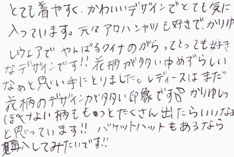 とても着やすく、かわいいデザインでとても気に入っています。元々アロハシャツも好きで、かりゆしウェアでやんばるクイナのがらってとっても好きなデザインです!!花柄が多い中めずらしいなぁと思い手にとりました。レディースはまだ花柄のデザインが多い印象です。かりゆしっぽくない柄ももっとたくさん出たらいいなぁと思っています!!バケットハットもあるなら購入してみたいです!!