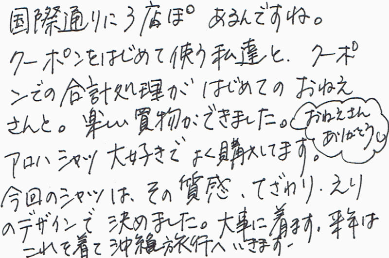 国際通りに3点ぽあるんですね。クーポンをはじめて使う私達と、クーポンでの合計処理がはじめてのおねえさんと。(おねえさんありがとう?)アロハシャツ大好きでよく購入してます。今回のシャツは、その質感、てざわり、えりのデザインで決めました。大事に着ます。来年はこれを着て沖縄旅行へいきます。