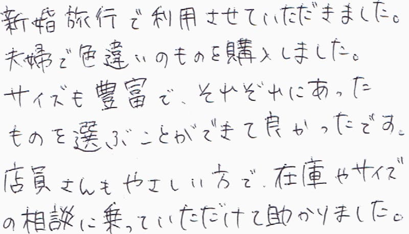 新婚旅行で利用させていただきました。夫婦で色違いのものを購入しました。サイズも豊富で、それぞれにあったものを選ぶことができて良かったです。店員さんもやさしい方で、在庫やサイズの相談に乗っていただけて助かりました。