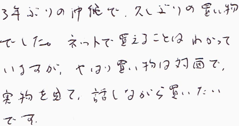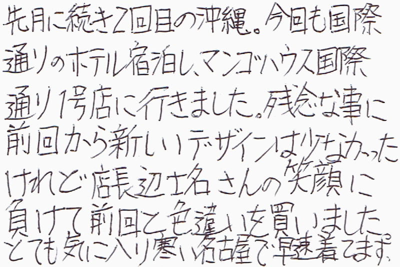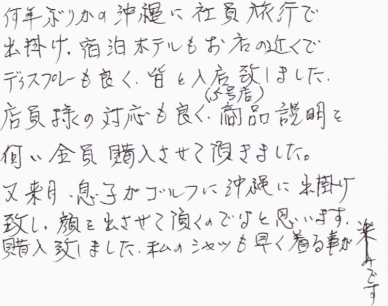 何年ぶりかの沖縄に社員旅行で出掛け、宿泊ホテルもお店の近くでディスプレーも良く、皆と入店致しました(5号店)店員様の対応も良く、商品説明を伺い全員購入させて頂きました。又来月、息子がゴルフに沖縄に出掛け致し、顔を出させて頂くのではと思います。購入致しました私のシャツも早く着る事が楽しみです