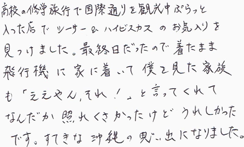 高校の修学旅行で国際通りを観光中ぷらっと入った店でシーサー&ハイビスカスのお気に入りを見つけました。最終日だったので着たまま飛行機に家に着いて僕を見た家族も「ええやん、それ!」と言ってくれてなんだた照れくさかったけどうれしかったです。すてきな沖縄の思い出になりました。