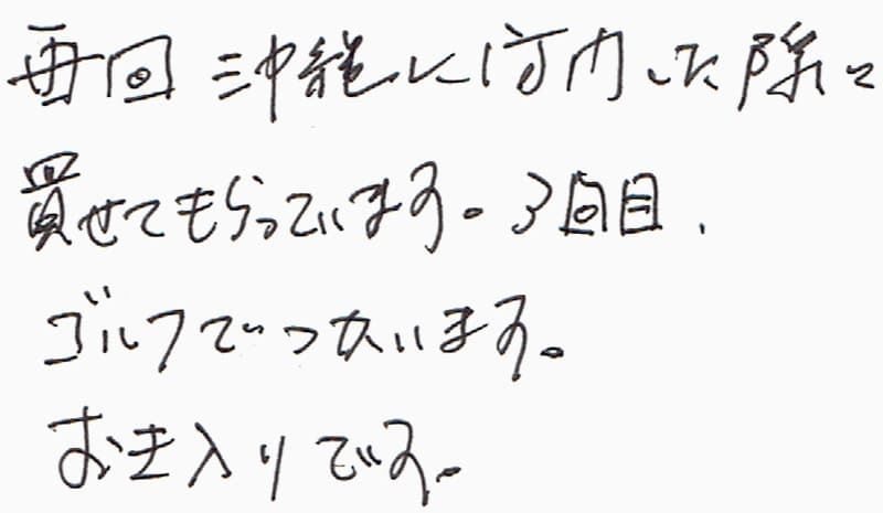 毎回沖縄に訪問した際に買せてもらっています。3回目。ゴルフでつかいます。おき入りです。