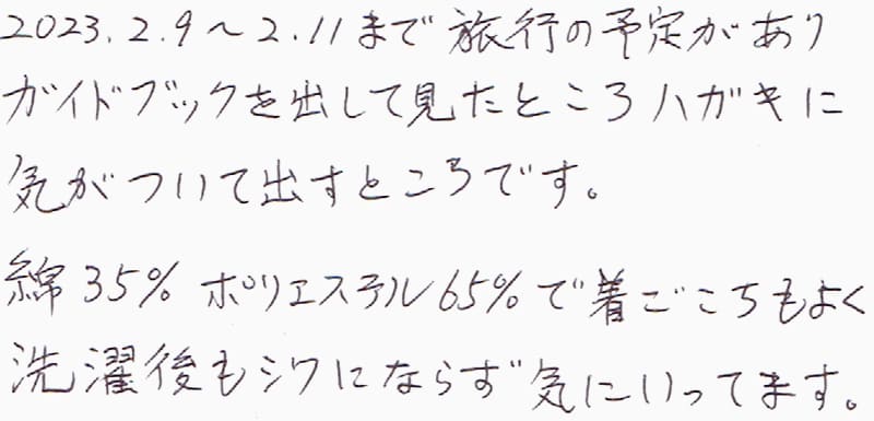 2023.2.9~2.11まで旅行の予定がありガイドブックを出して見たところハガキに気がついて出すところです。綿35%ポリエステル65%で着ごこちもよく洗濯後もシワにならず気にいってます。