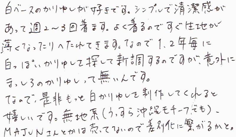 白ベースのかりゆしが好きです。シンプルで清潔感があって週2~3回着ます。よく着るのですぐ生地が薄くなったりへたれてきます。なので、1.2年毎に白っぽいかりゆしを探して新調するのですが、意外にましろのかりゆしって無いんです。なので、是非もっと白かりゆしを制作してくれると嬉しいです。無地系(うっすら沖縄モチーフでも)、MAJUNさんとかは売ってないので差別化に繋がるかと。