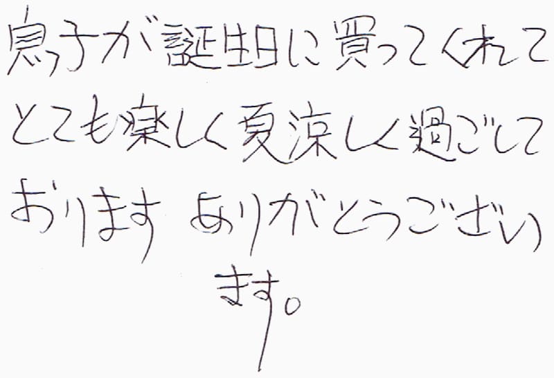息子が誕生日に買ってくれてとても楽しく夏涼しく過ごしております。ありがとうございます。