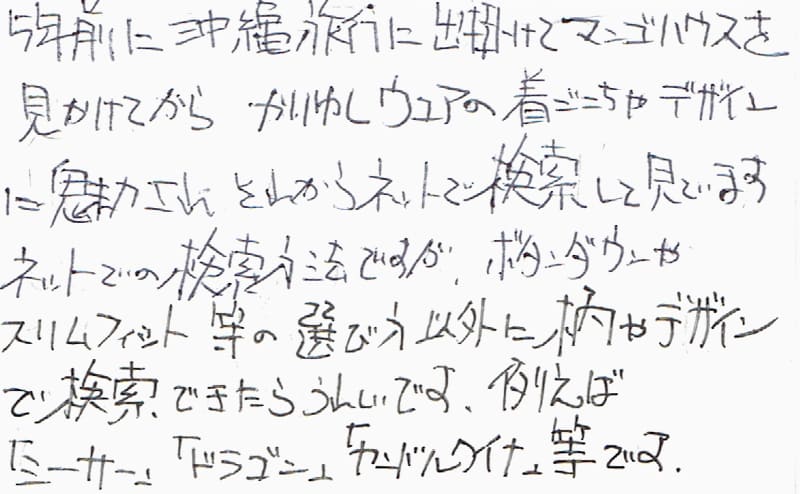 5年前に沖縄旅行に出掛けてマンゴハウスを見かけてからかりゆしウェアの着ごこちやデザインに魅了されそれからネットで検索して見ています。ネットでの検索方法ですが、ボタンダウンやスリムフィット等の選び方以外に柄やデザインで検索できたらうれしいです。例えば「シーサー」「ドラゴン」「ヤンバルクイナ」等です。