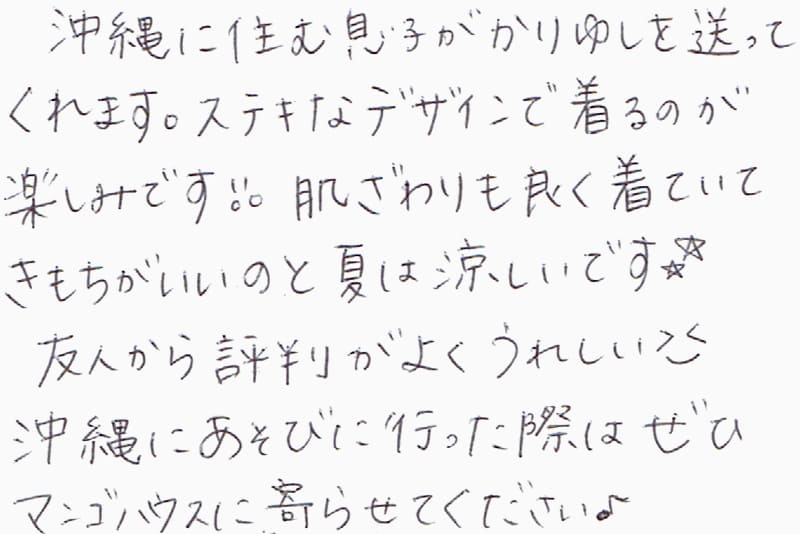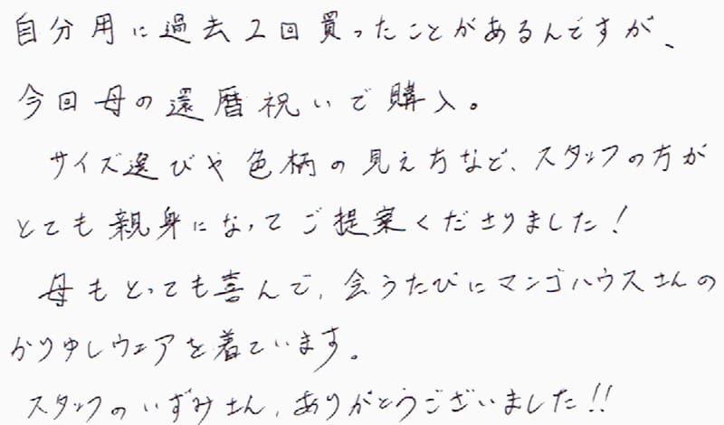 自分用に過去2回買ったことがあるんですが、今回母の還暦祝いを購入。サイズ選びや色柄の見え方など、スタッフの方がとても親身になってご提案くださりました!母もとっても喜んで、会うたびにマンゴハウスさんのかりゆしウェアを着ています。スタッフのいずみさん、ありがとうございました!!