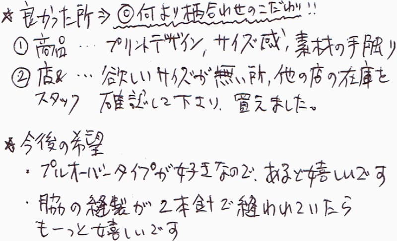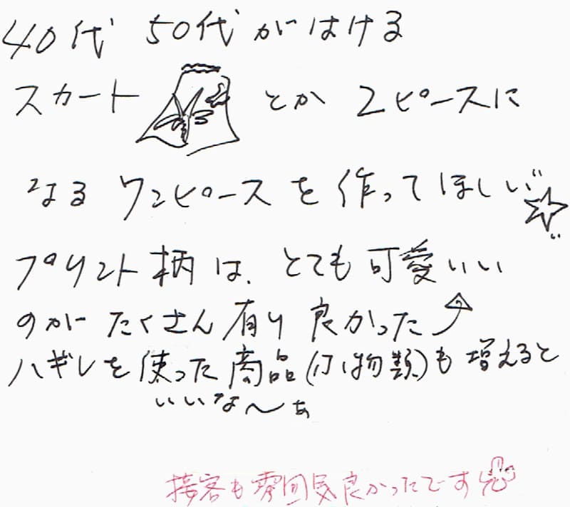40代50代がはけるスカートとか2ピースになるワンピースを作ってほしい。プリント柄はとても可愛いのがたくさん有り良かった!ハギレを使った商品(小物類)も増えるといいなーぁ(接客も雰囲気良かったです!)