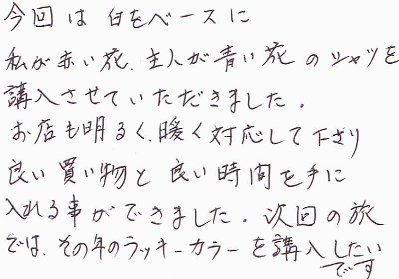 今回は白をベースに私が赤い花、主人が青い花のシャツを購入させていただきました。お店も明るく、暖く対応して下さり良い買い物と良い時間を手に入れる事ができました。次回の旅では、その年のラッキーカラーを購入したいです