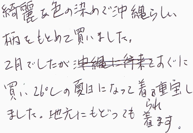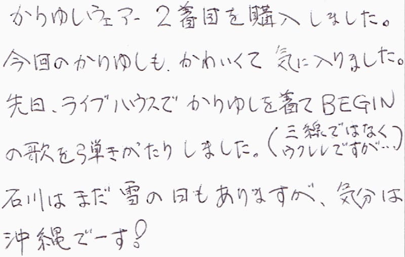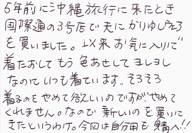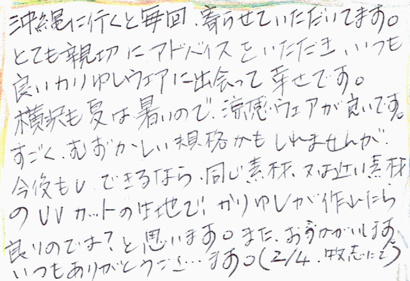 沖縄に行くと毎回、寄らせていただいています。とても親切にアドバイスをいただき、いつも良いかりゆしウェアに出会って幸せです。横浜も夏は暑いので、涼感ウェアが良いです。すごく、むずかしい規格かもしれませんが、今後もし、できるなら、同じ素材、又は近い素材のUVカット生地で、かりゆしが作れたら良いのでは?と思います。また、おうかがいします。いつもありがとうございます。(2/4、牧志にて)