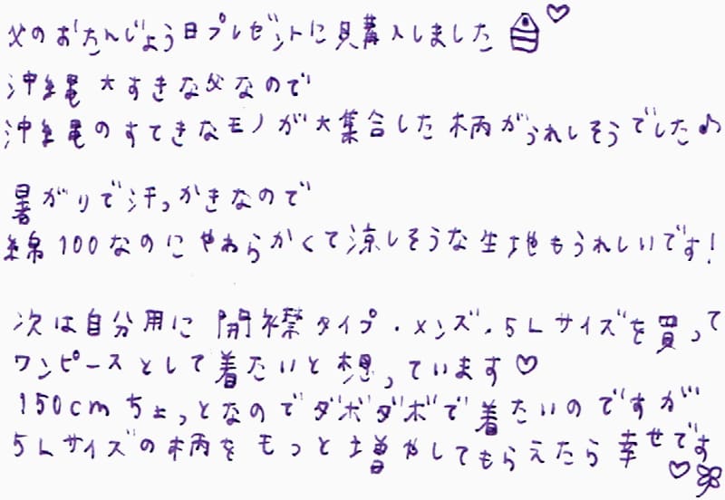 父のおたんじょう日プレゼントに購入しました。沖縄大好きな父なので沖縄のすてきなモノが大集合した柄がうれしそうでした♪暑がりで汗っかきなので綿100なのにやわらかくて涼しそうな生地もうれしいです!次は自分用に開襟タイプ、メンズ、5Lサイズを買ってワンピースとして着たいと想っています。150cmちょっとなのでダボダボで着たいのですが5Lサイズの柄をもっと増やしてもらえたら幸せです。