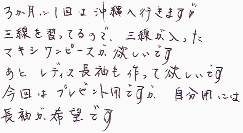 3か月に1回が沖縄へ行きます!三線を習ってるので、三線が入ったマキシワンピースが欲しいです。あとレディース長袖も作って欲しいです。今回はプレゼント用ですが、自分用には長袖が希望です
