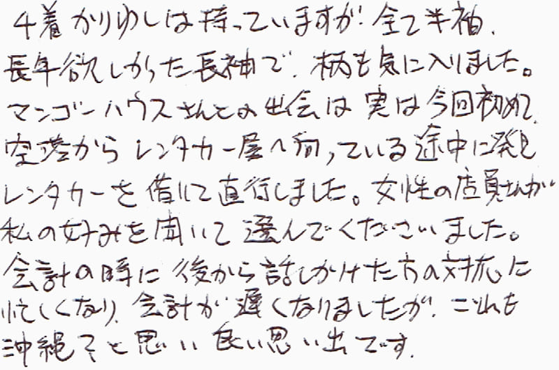 4着かりゆしは持っていますが、全て半袖。長年欲しかった長袖で、柄も気に入りました。マンゴーハウスさんとの出会は実は今回初めて。空港からレンタカー屋へ向っている途中に発見。レンタカーを借りて直行しました。女性の店員さんが私の好みを聞いて選んでくださいました。会計の時に後から話しかけた方の対応に忙しくなり、会計が遅くなりましたが、これも沖縄?と良い思い出です。