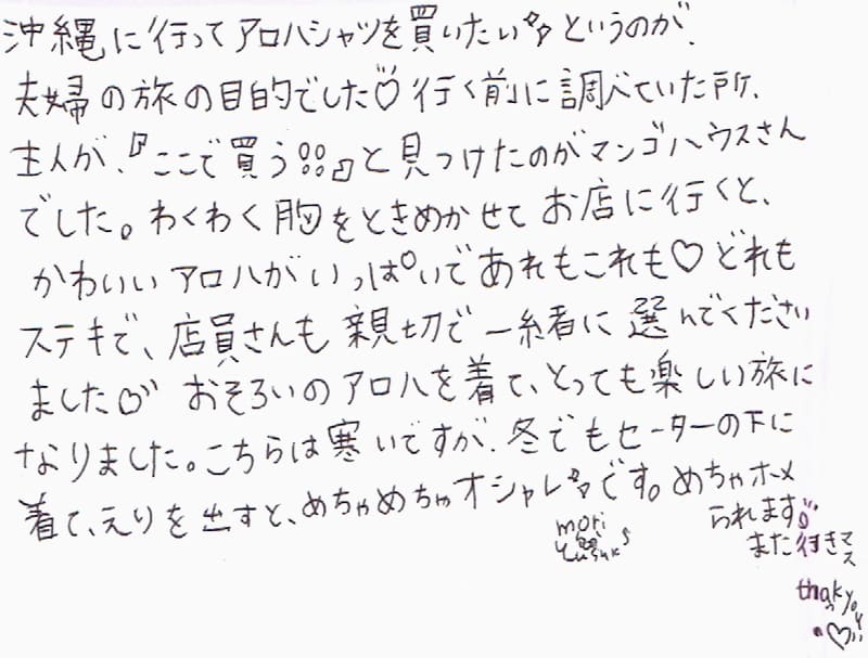 沖縄に行ってアロハシャツを買いたい!というのが、夫婦の旅の目的でした。行く前に調べていた所、主人が『ここで買う!!』と見つけたのがマンゴハウスさんでした。わくわく胸をときめかせてお店に行くと、かわいいアロハがいっぱいであれもこれも!どれもステキで、店員さんも親切で一緒に選んでくださいました。おそろいのアロハを着て、とっても楽しい旅になりました。こちらは寒いですが、冬でもセーターの下に着て、えりを出すと、めちゃめちゃオシャレです。めちゃホメられます。また行きマス。thank you!