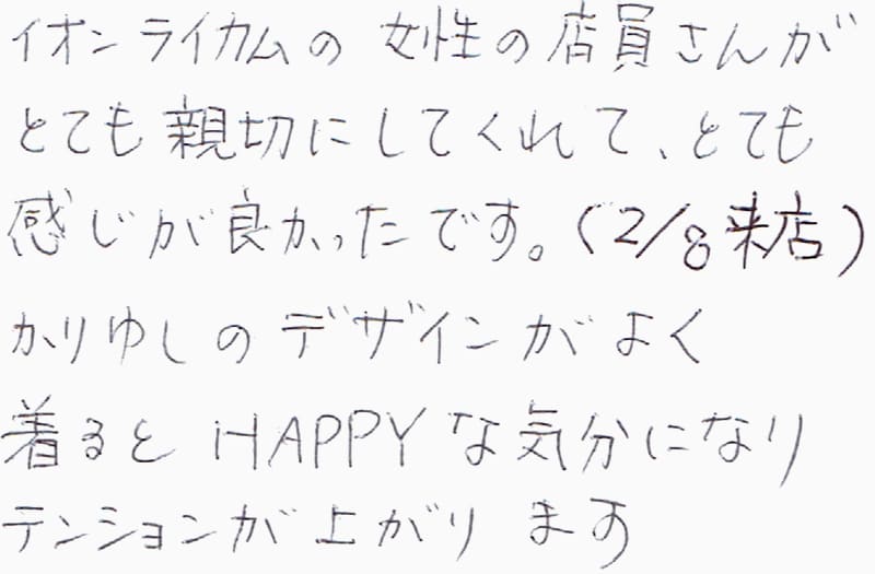 イオンライカムの女性の店員さんがとても親切にしてくれて、とても感じが良かったです。(2/8来店)かりゆしのデザインがよく着るとHAPPYな気分になりテンションが上がります