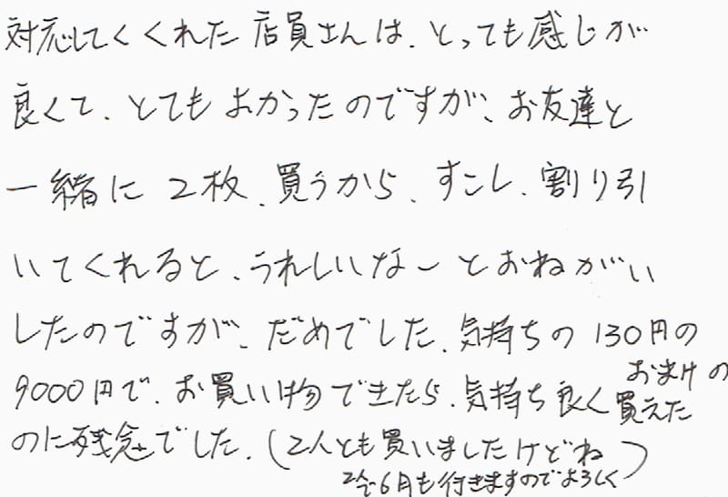 対応してくれた店員さんは、とっても感じが良くて、とてもよかったのですが、お友達と一緒に2枚買うから、すこし、割り引いてくれるとうれしいなーとおねがいしたのですが、だめでした。気持ちの130円のおまけの9000円でお買い物できたら気持ち良く買えたのに残念でした。(2人とも買いましたけどね。2人で6月も行くのでよろしく)